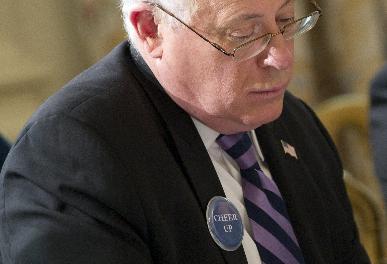 Gov. Pat Quinn’s button says “Cheer up.” Umm…