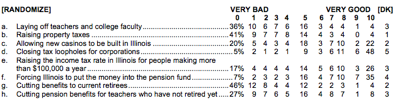 Now I am going to read you possible ways to close the deficit in the pension systems in Illinois and I would like you to rate each one using a scale from 0 to 10. A 0 on this scale means you think that proposal is a VERY BAD idea. A 10 on this scale means you think that proposal is a VERY GOOD idea.