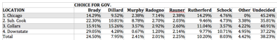Brady does best Downstate, but he still has some significant residual impact in the suburbs, particularly in Cook. Dillard is essentially tied with Brady in the collars, which is probably residual from 2010 and the fact that he’s from DuPage. Rutherford does best against Brady in Chicago, where they’re tied, but slightly trails Congressman Aaron Schock for a distant third place in Downstate.