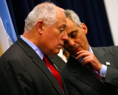 * Gov. Pat Quinn and Chicago Mayor Rahm Emanuel discuss… something…