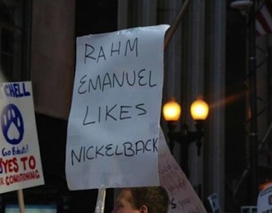 Chicago Mayor Emanuel doesn’t actually like Nickelback, despite a sign at the teachers strike that indicated otherwise.