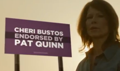 Quinn is hugely unpopular everywhere, so that ad ain’t good for Bustos at all. And Schilling employs a clever visual with that fake “Cheri Bustos endorsed by PAT QUINN” billboard in the background…