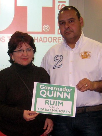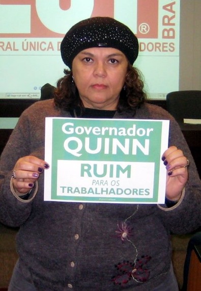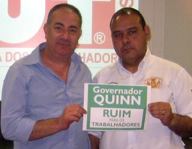In late September, Gov. Quinn took a six-day junket to meet with CEOs and politicians in Brazil. Public employees and labor leaders there were waiting with their own “Pat Quinn Truth Squad”! The signs in Portuguese read, “Governor Quinn, Bad for Workers”. In this photo: Graca Costa (left), president of the National Confederation of Municipal Workers (CONFETAM), and Vagner Freitas (right), vice president of the Unified Workers Central (CUT).