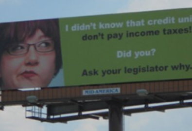 It is so sad that bankers feel it necessary to waste their customers money on yet another attack on credit unions. If they have that much excess money to toss around, why not just mail it to the state of Illinois. I noticed the IBA did not have the courage to put their name on billboards, at least Al Qaeda takes credit for their unnecessary attacks on the innocent. Did the banks dare to declare how many are Subchapter S banks are in Illinois and don’t pay either state or federal corporate income tax. It is so sad to see the banking industry result to underhanded tactics in an attempt to incite anger amongst the public. Credit Unions are not ashamed to “Walk Their Talk” with members, consumers, Legislators or whomever wants to hear our story. Credit Unions are an alternative cooperative financial industry that offers consumers a more cost effective way to do business and to the industries credit, do not attack banks. As Patrick Henry once said, “Don’t Tread on Me”. Maybe the banks should consider the wisdom of those words.