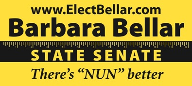 “Dr. Bellar served as a Benedictine nun for five years and remains active in her church,” Bellar claims in a biography on her campaign website, which includes a logo that reads: “Barbara Bellar, State Senate, There’s ‘Nun’ Better.”