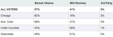 Given that Obama has 44% in the collars compared to Quinn’s 39.27% and 46% downstate compared to Quinn’s 34.18%, I’d say the Dems are going to fare a bit better than 2 years ago.