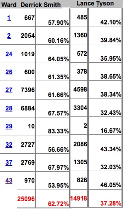 Here are the ward-by-ward results for the Smith-Tyson race…