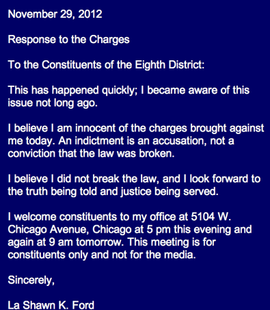 * Whatever you may think of the charges, these town hall meetings are a pretty gutsy move by indicted state Rep. LaShawn Ford (D-Chicago). From an e-mail sent to his constituents yesterday afternoon…