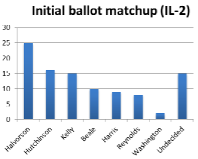 Unlike state Sen. Toi Hutchinson’s poll, Kelly’s pollster only asked about the top seven candidates. Actually, they asked about eight candidates, but then David Miller dropped out and they used voters’ “second choice” responses to reallocate his support elsewhere.