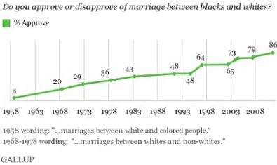 Notice that it wasn’t until the 1990s that a majority of Amerians finally approved of interracial marriage.