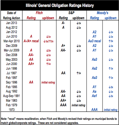 * The Illinois Commission on Government Forecasting and Accountability’s latest monthly report includes a history of Illinois’ bond ratings dating back to 1973…