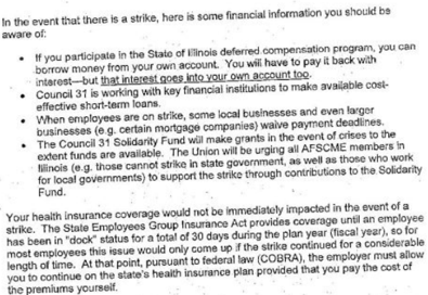 With the American Federation of State, County and Municipal Employees union at odds with Gov. Pat Quinn over a new bargaining agreement, government workers received a letter this week outlining steps they can take in the event a strike is authorized.
