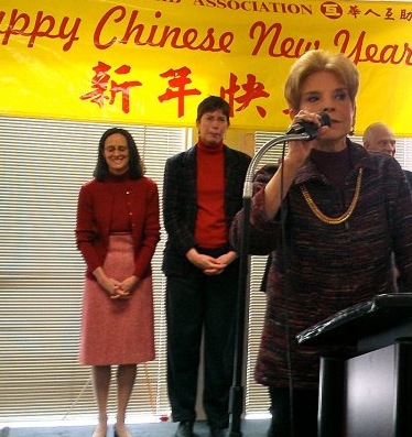 Comptroller Topinka relates an old story in her native Czech to those gathered in Chinatown for the New Year Celebration, while Lt. Gov. Simon (of Southern Illinois) admittedly struggles throughout at interpretation, and while AG Lisa Madigan giggles dutifully along (later chuckling alound that she had “absolutely no idea” what the Comptroller was carrying on about).