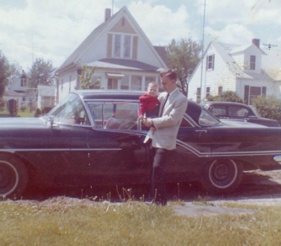This picture was taken right before we left for your baptism. The Olds had red and black leather interior, power everything, was made for cruising and only cost $400 in 1963!