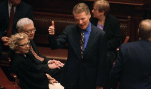Speaker Madigan, while openly and boldly campaigning for his daughter Lisa Madigan on the Floor of the Illinois House of Representatives, gives a hearty “thumbs up” upon learning of Illinois Supreme Court Justice’s Anne Burke’s willingness to talk to her husband-the powerful, long-time Chicago Ald. Ed Burke about actively throwing his support behind daughter Lisa if she announces her intention to run for Governor as some expect, as well as excitedly reacting to the Justice’s assurance to the Speaker of swearing-in the younger Madigan at the next Inauguration if she is elected next Illinois Governor. Roger Ebert, famous media Film Critic, who’d just taught the Speaker how to best portray the “thumbs up” sign from his former hit movie review television show, looks on approvingly as well.