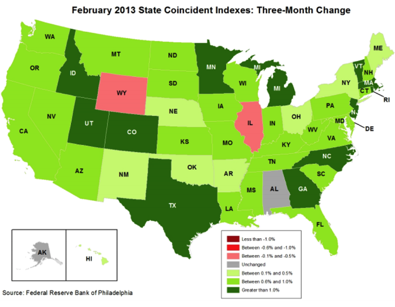 The Federal Reserve Bank of Philadelphia has released the coincident indexes for the 50 states for February 2013. In the past month, the indexes increased in 45 states, decreased in three (Alabama, Illinois, and New Mexico), and remained stable in two (Hawaii and Wyoming), for a one-month diffusion index of 84. Over the past three months, the indexes increased in 46 states, decreased in two (Illinois and Wyoming), and remained stable in two (Alaska and Alabama)