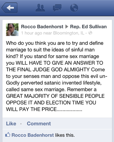 * The comments on GOP state Rep. Ed Sullivan’s Facebook page have been overwhelmingly positive since he announced he was voting for the gay marriage bill. But, there’s always one goofball in the bunch…