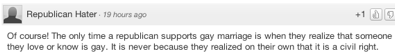 Also, keep in mind that the entire nation is being moved to support gay rights as more gay people have come out of the closet. So, that commenter’s “logic” (which some national Democratic pundit types have also been using) isn’t just an indictment of Republicans, it’s an indictment of the majority of Americans.