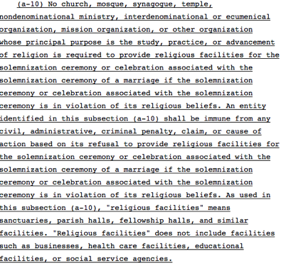 The bill specifically states that “religious facilities” does NOT include educational facilities. It would thus appear that Catholic Universities, such as DePaul, Loyola, etc, would be required under civil penalty to make their facilities available for same sex marriage ceremonies or receptions. Also, the law does not appear to provide any protection for religious fraternal organizations, such as the Knights of Columbus, to restrict the use of their facilities for same sex marriages.