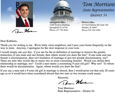 * I talked with Rep. Morrison this morning. He clearly regretted sending the e-mail, which he said he did in haste, adding “I don’t hate anybody,” and saying he wanted to have a “healthy debate” on the issue. He also insisted that he didn’t ever mean to imply that proponents are “advocating for statutory rape.”
