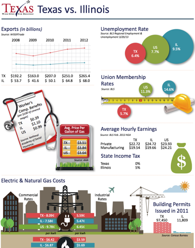 Let’s add one more Stake in the heart of IL for this article. TX is not looking at billions in unfunded pensions, Billions in unpaid bills, an increasing deficit, and a legislature that appears to be adverse to doing anything on these issues other than raising taxes. Don’t get me wrong i am far from saying TX is perfect. But you seem to have a large constituency here in IL who looks at business as if it were a nice plump sheep and they the wolves. It is hard to put that perspective into numbers.