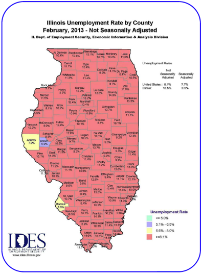 * From a COGFA report on the Illinois economy. Click the pics for a larger view. Unemployment by counties…