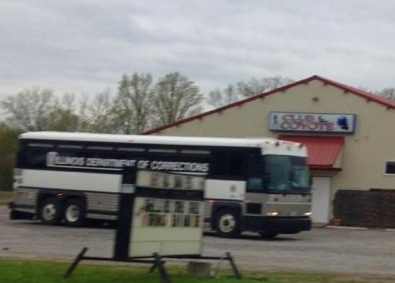 The picture shows an IDOC inmate transport bus parked Friday afternoon, outside Club Coyote, a “gentlemen’s club” on U.S. Highway 51 in De Soto that features exotic dancers and serves alcohol.