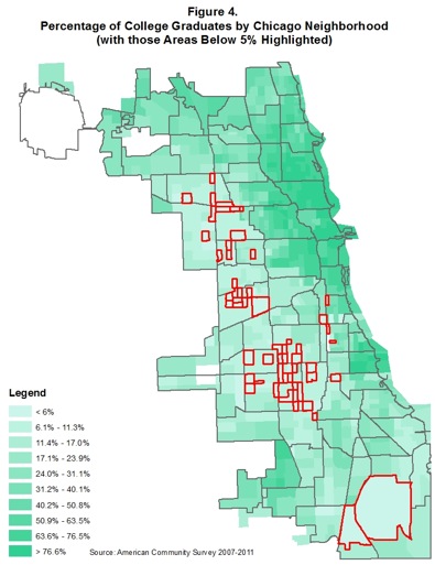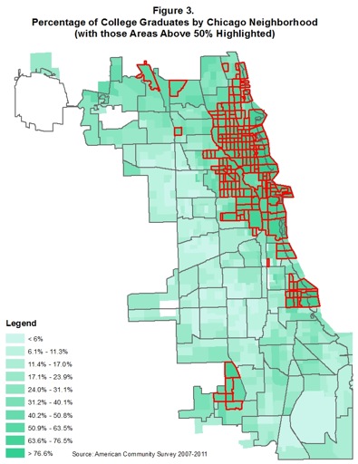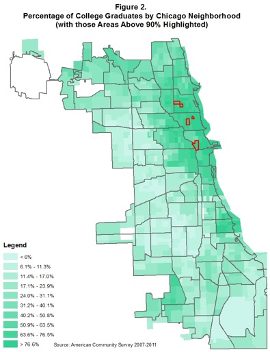 In fact, college graduate-majority areas are largely confined to the North Side along the lake, Hyde Park and Beverly.