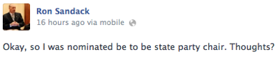 Ron Sandack would be a big step forward for my party. He delivers a clear, articulate message and has embraced social media more effectively than just about any other republican in the state. We need to move our party forward and begin to bring independents back into the republican voting mix. Ron would be a big step in the right direction.