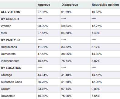 Ironically, I was actually surveyed in this last night. To the results its not a done deal for Governor McSqueezy. I mean he still has a majority of Dems approving of him and still has majority approval in Chicago. With the Madigan brand being front and center in the pension fight it might help Quinn gain some “at least he didn’t do that” voters. Regardless of what he’s said in the past about pensions. So, overall I think it could be worse for him. Downstate is not as important in a Democratic Primary. In the general it looks bad with the suburbs, but the GOP field is shall we say challenged…so anything could happen.