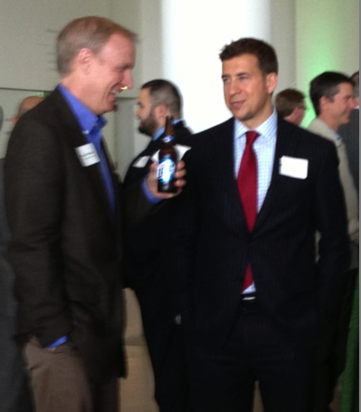 * Republican gubernatorial candidate Bruce Rauner and former Democratic state treasurer Alexi Giannoulis chat during a wind industry event…