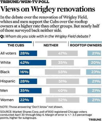 Geographically, voters in North Side wards sided with the Cubs, 43 percent, to 19 percent for the rooftop owners, while 37 percent sided with neither.