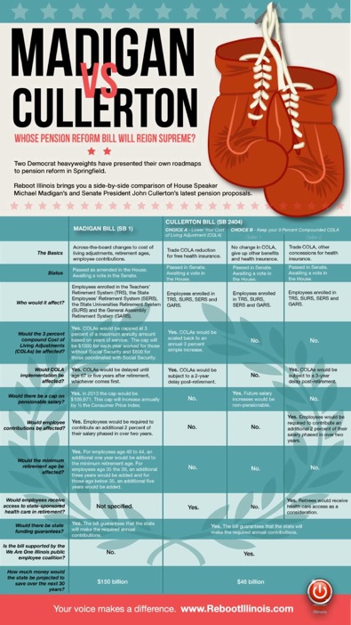 * Reboot Illinois has a pretty good side-by-side comparison of House Speaker Michael Madigan’s pension reform bill and Senate President John Cullerton’s bill. Click the pick for a much larger image…