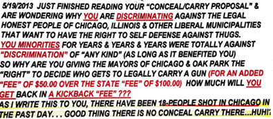 There are idiots in every aspect of our society. In our communities, at our jobs, in our clubs. I can tell you his racist garbage is not indicative of the concealed carry movement in Illinois.