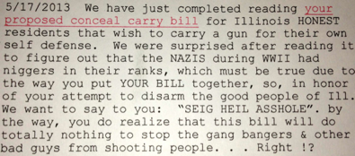 Those two look like they came from the same source. I know for a fact that ISRA and Illinois Carry go to great lengths to ensure their members communicate with legislators respectfully. That said, you can’t stop the crazy. I know for a fact that Illinois Carry has sent a few extremists packing.
