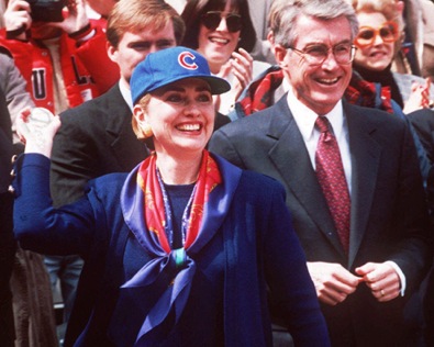 “First Lady Hilary Clinton instructs Governor Edgar and the Chicago Cubs bullpen on how to throw a ball. Interestingly, the Cubs are still using the Clinton Model of Pitching today.”