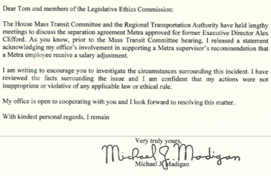 * House Speaker Michael Madigan has sent a letter to Legislative Inspector General Tom Homer and the bipartisan Legislative Ethics Commission asking it to investigate the Metra allegations. Madigan denied that he violated any “applicable law or ethical rule.”