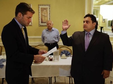 Michael Kasper, left, swears in Jaime Andrade as the new State Representative for the seat left vacant by Deb Mell.