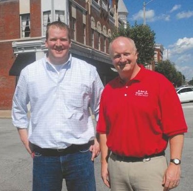 Jason Plummer (left), who says he has no interest in running for office again, is pictured at left with DuPage County auditor Bob Grogan in downtown Du Quoin during their visit on Thursday.