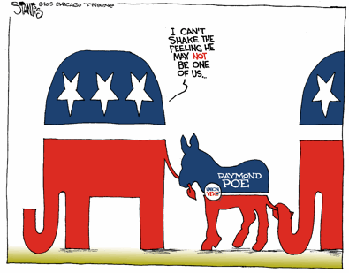 Poe represents his district and he does it well. To suggest that somehow makes him a Democrat is as ludicrous as calling his chief rival Rep. Jim Durkin a Democrat because he has voted with the trial lawyers in the past.
