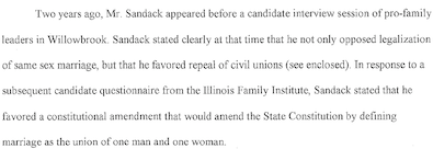 Ron Sandack is a class act, and has recognized that this is not only the right thing to do, it is about the future of his party. Most people under 30, or maybe even 35, and many of all ages won’t be a part of a party that doesn’t acknowlege that all Illinois residents should have the right to marry…there will be fewer and fewer that will accept this every year. In a few years, Barickman, Eddie Sullivan and Sandack will be lauded for their willingness to stand out to do the right thing and look forward toward the future of their party. For example, the majority of House Republican staffers support marriage equality. Too bad the majority of their own caucus is so out of step.