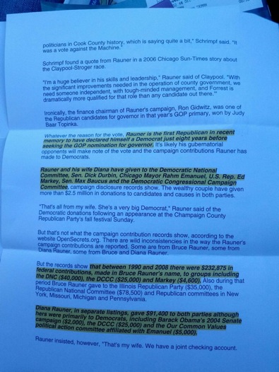 * Top Republicans received an interesting little mailer this week. The entirety of the letter was a recent Tom Kacich column in the Champaign News-Gazette about Republican gubernatorial candidate Bruce Rauner’s unusually large number of ties to Democrats. The sender highlighted the most important parts. Here’s a cellphone pic of one page of the letter…
