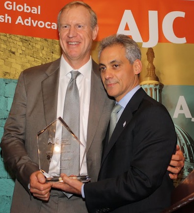 * Rahm Emanuel and Bruce Rauner cuddle up at an awards ceremony last year…