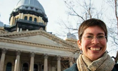 Sheila Simon looking pleased to have been chosen the person in Illinois politics who most resembles the Illinois Capitol building.