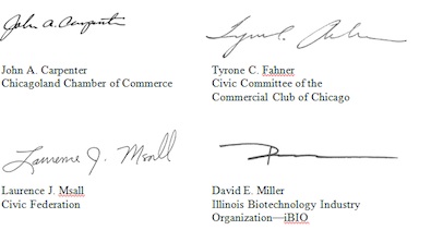 We are writing as a coalition of Illinois’ major employers and civic groups to ask you to support the bipartisan pension reform bill that was agreed to by the four legislative leaders last week. The bill is to be discussed on December 3rd in a Conference Committee hearing.