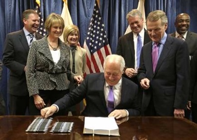 Bottom picture: The legislators at the signing ceremony laugh at the funnies written on the oblivious Gov. Quinn’s head by Speaker Madigan and Rep. Durkin.