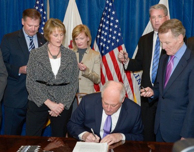 Madigan watches Illinois Governor Pat Quinn sign the pension bill and anxiously hopes the Governor gives him his pen back.