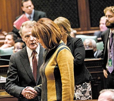 * House Speaker Michael Madigan shakes Rep. Carol Sente’s hand after last week’s pension reform vote…