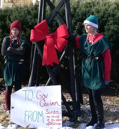 “Yes, yes, this is Gov. Quinn. Yes, I did call to report a group of Santa’s elves in my front yard. Yes, I did claim the elves were erecting an unauthorized oil well. Hello? Are you there, 911? Hello? Sheesh, that’s the third fracking time!”