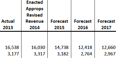 The budget office’s spending projections (which you can see here) use existing law with existing programs, and calculate savings from the pension reform bill in FY 16 and 17. So, they’re projecting increases all around. But those increases won’t exist without those income tax revenues.